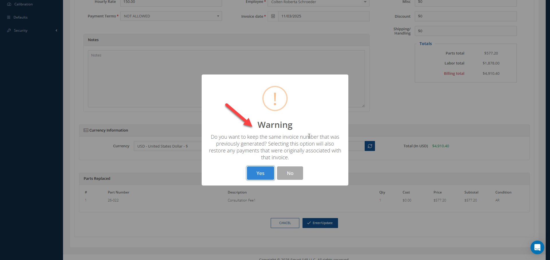 Sometimes, users need to reverse invoices in order to edit a Work Order, Sales Order, or Repair Order. Once the changes have been made, the order must be re-invoiced. However, the new invoice is not always saved with the same number as the original, even when the system prompts the user to keep the previous invoice number during the invoicing process.