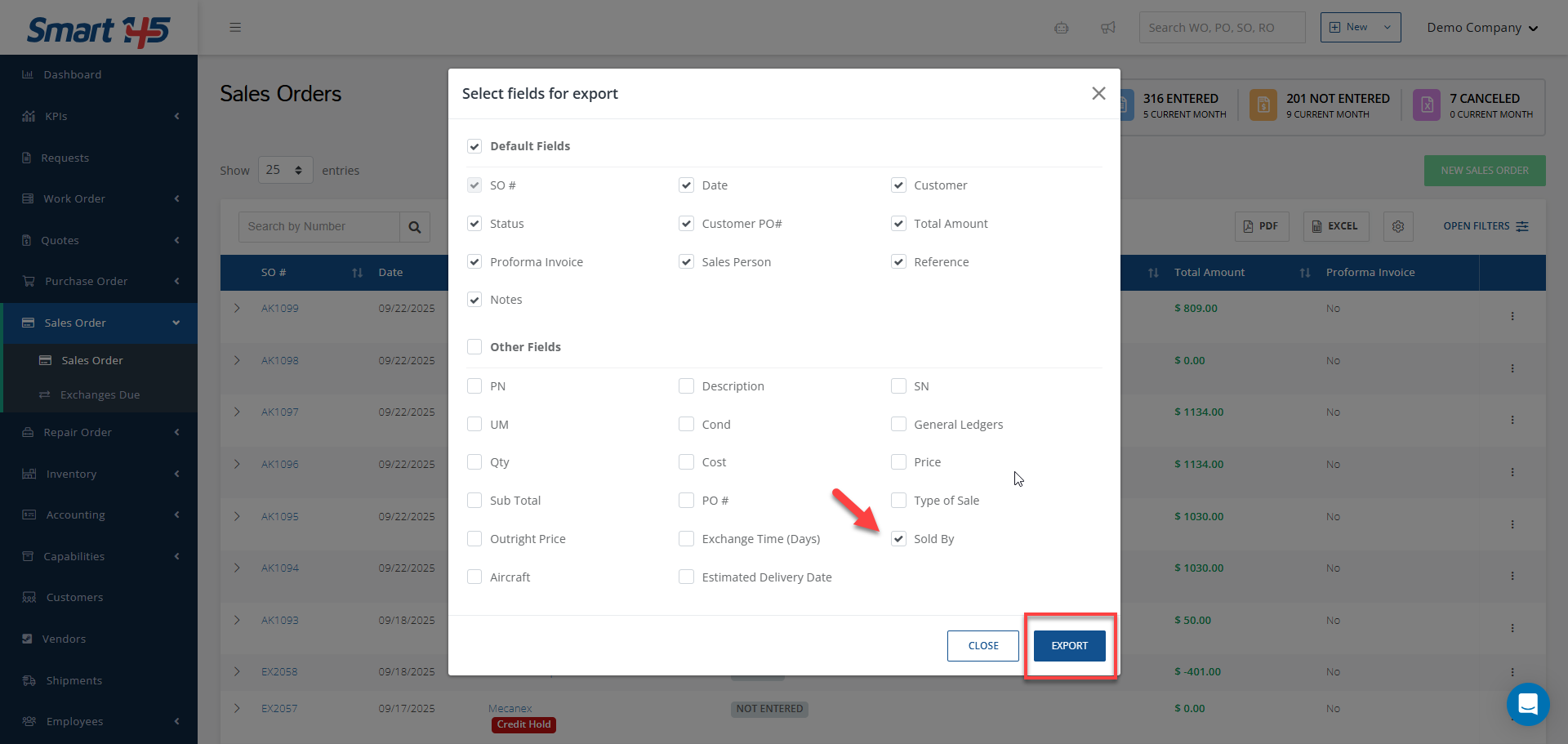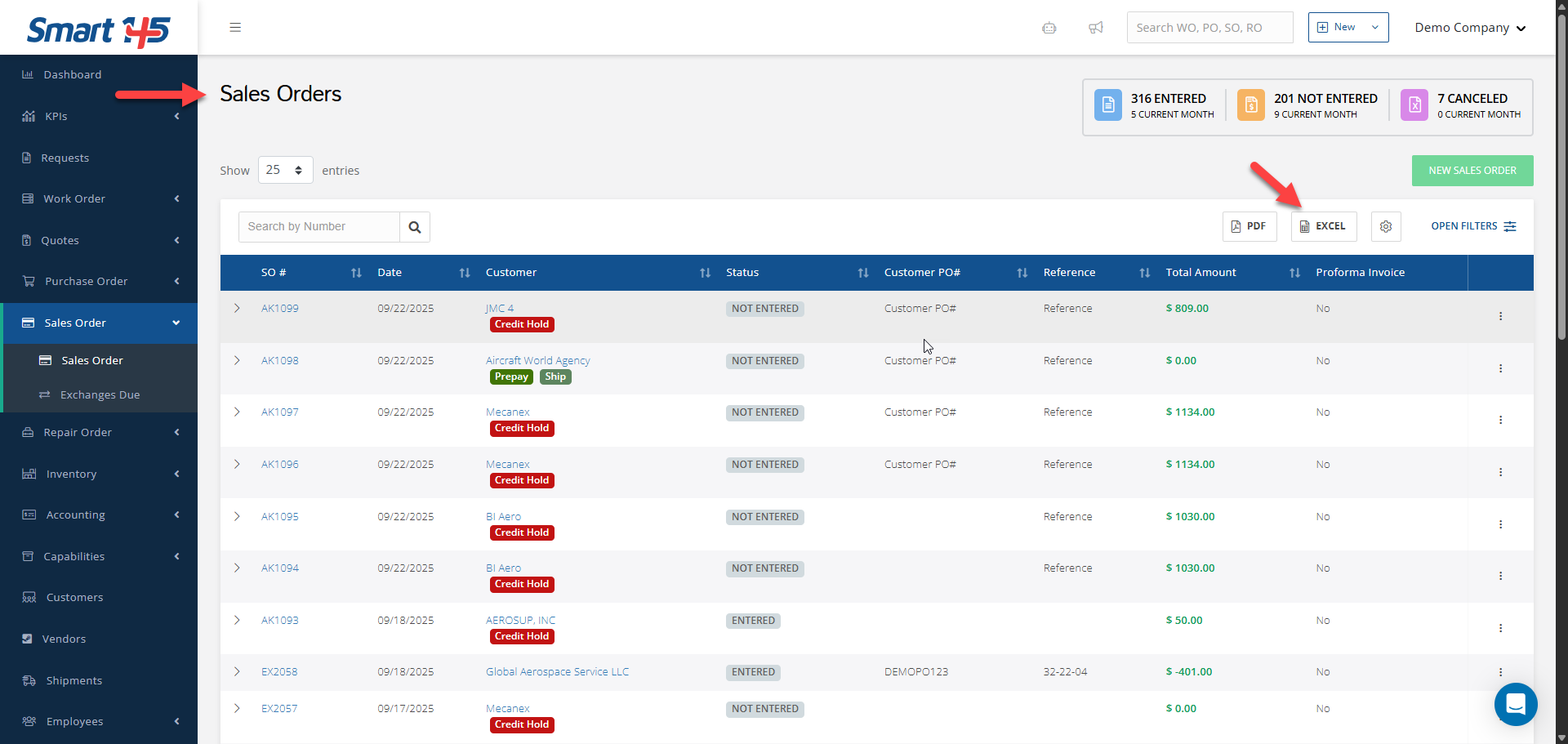 1- From the Sales Order screen, click the Excel icon at the top right to export the data into a spreadsheet.