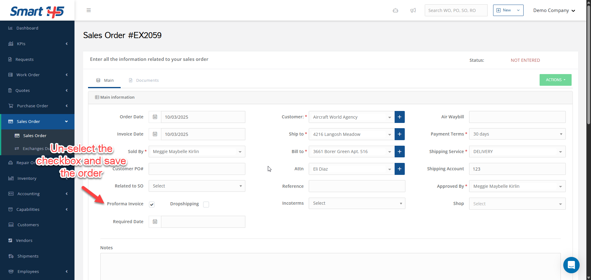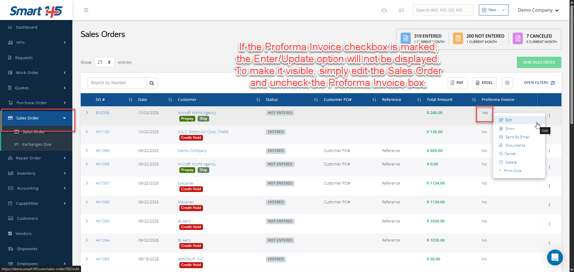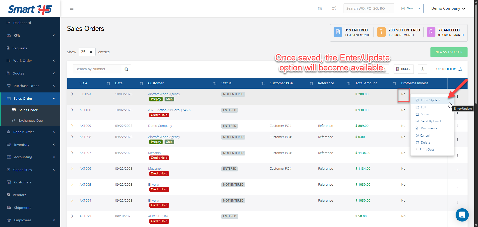 If this option does not appear, one of the most common causes is that the Proforma Invoice checkbox is selected. To resolve this, simply edit the Sales Order and uncheck the box. Once updated, the Enter/Update option will become available.