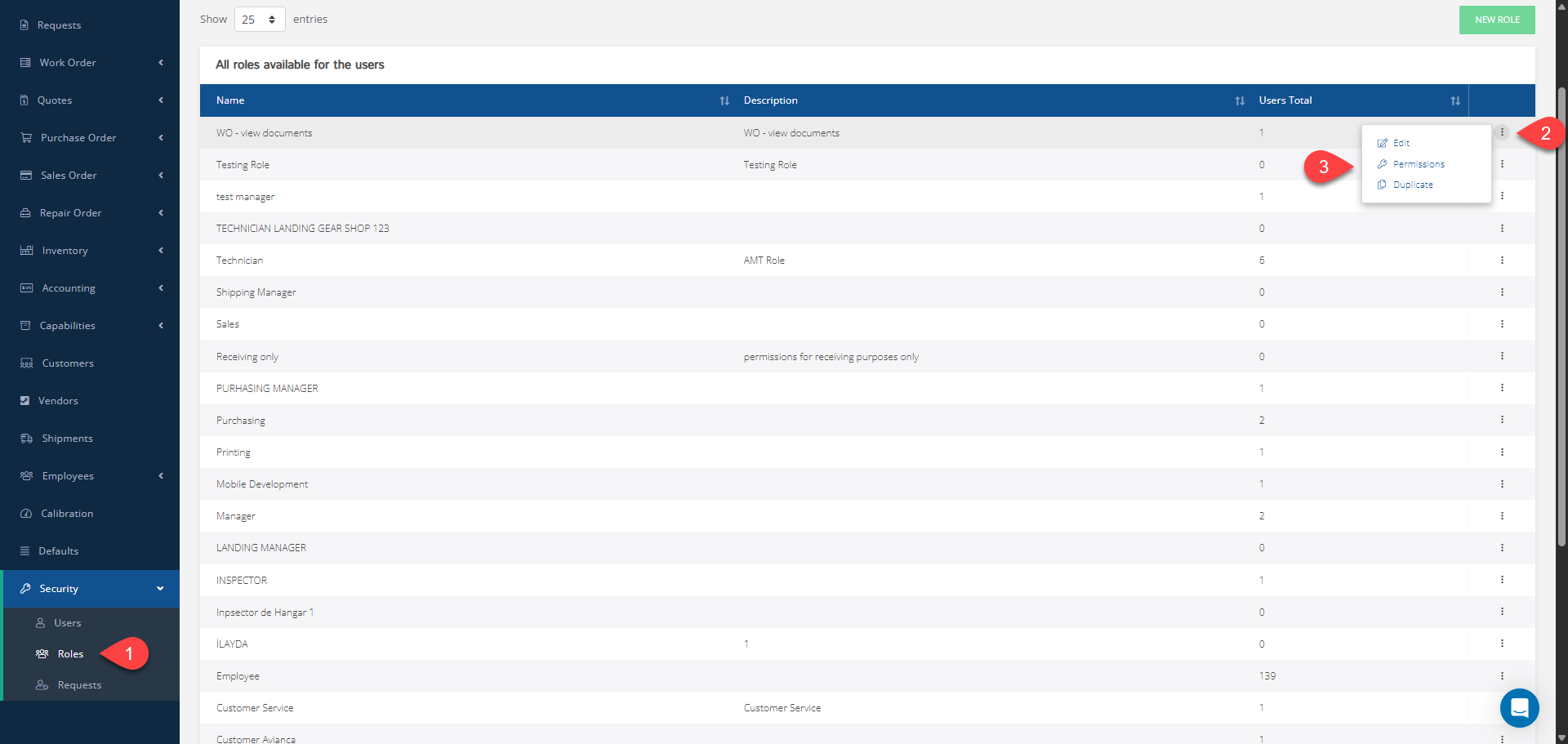 a) Go to Security>Roles, and then click on Permissions in the three-dots menu on the right side of the screen.