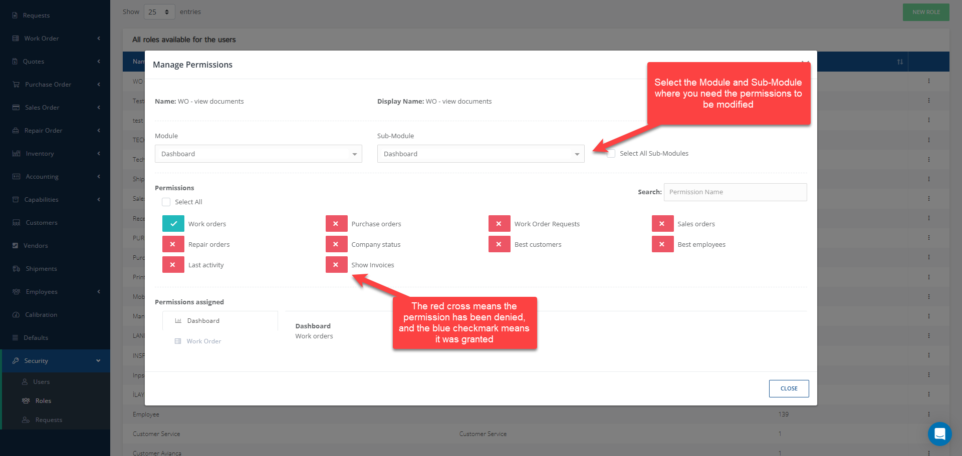 b) Select the Module and Submodule where you need the permissions to be modified and either restrict it by clicking with a red cross or grant it with the blue checkmark