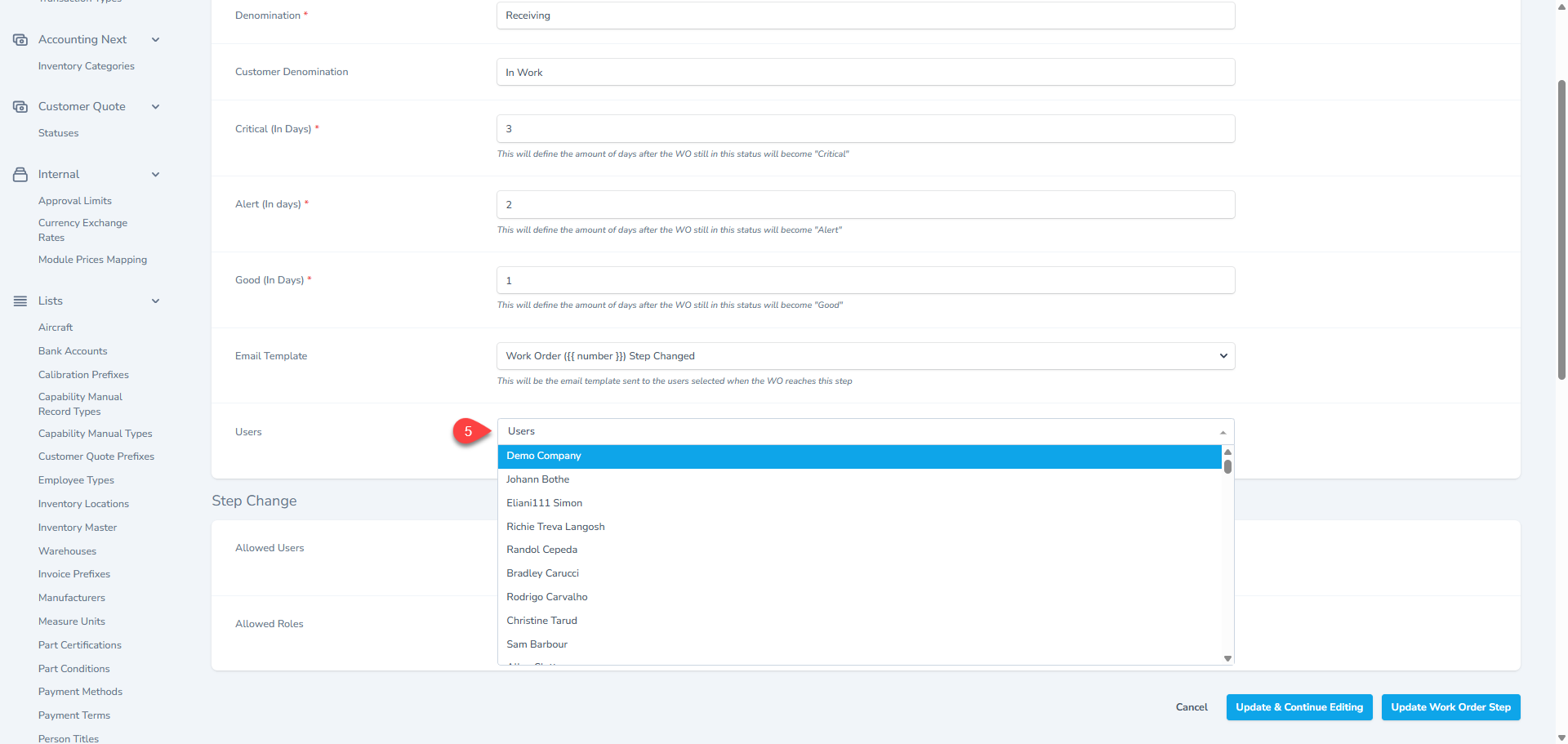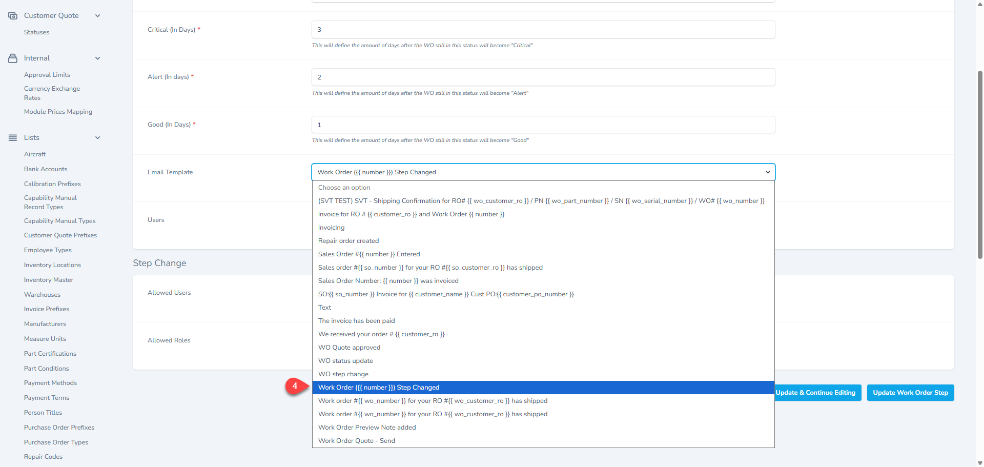 In order to get notifications when the Work Order Steps change, you must first get to the "Administration" dashboard: Then, scroll down to the lower part of the page and click on "Work Order Steps". Afterwards, edit a step to assign notifications to it (you can also assign notifications when creating new Work Order Steps) While editing the step, select the Step Change email template, as shown in the image below. Select the user or users you want the email to be sent to. (Please note that technician-type users will only receive a notification if the work order whose step changed is assigned to them) Once the work order reaches that step, the users will automatically receive an email notification.