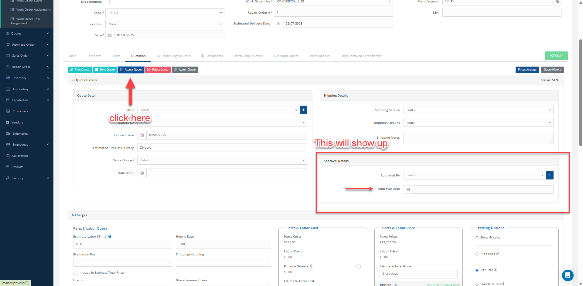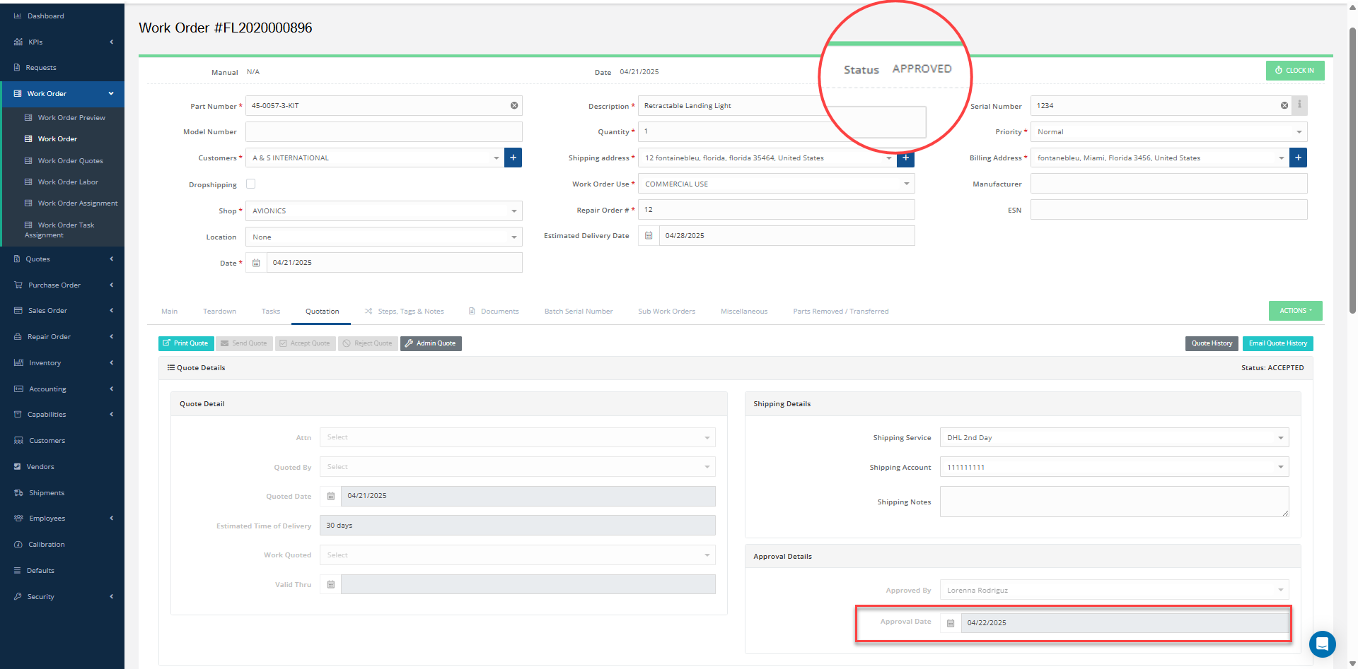 Upon doing so, a field will appear to enter an approval or rejection date. Saving this date will update the work order status accordingly.