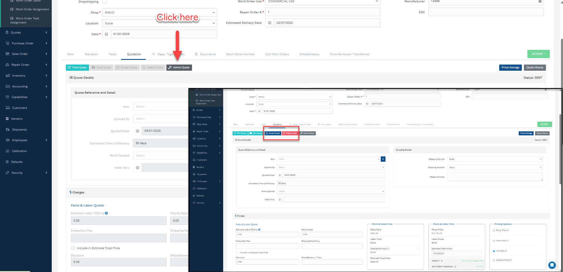 Once the work order has been quoted, you can approve or reject it directly from the Quotation tab by enabling the "Admin Quote" button and selecting the corresponding action.