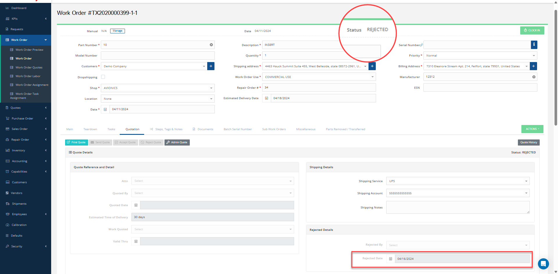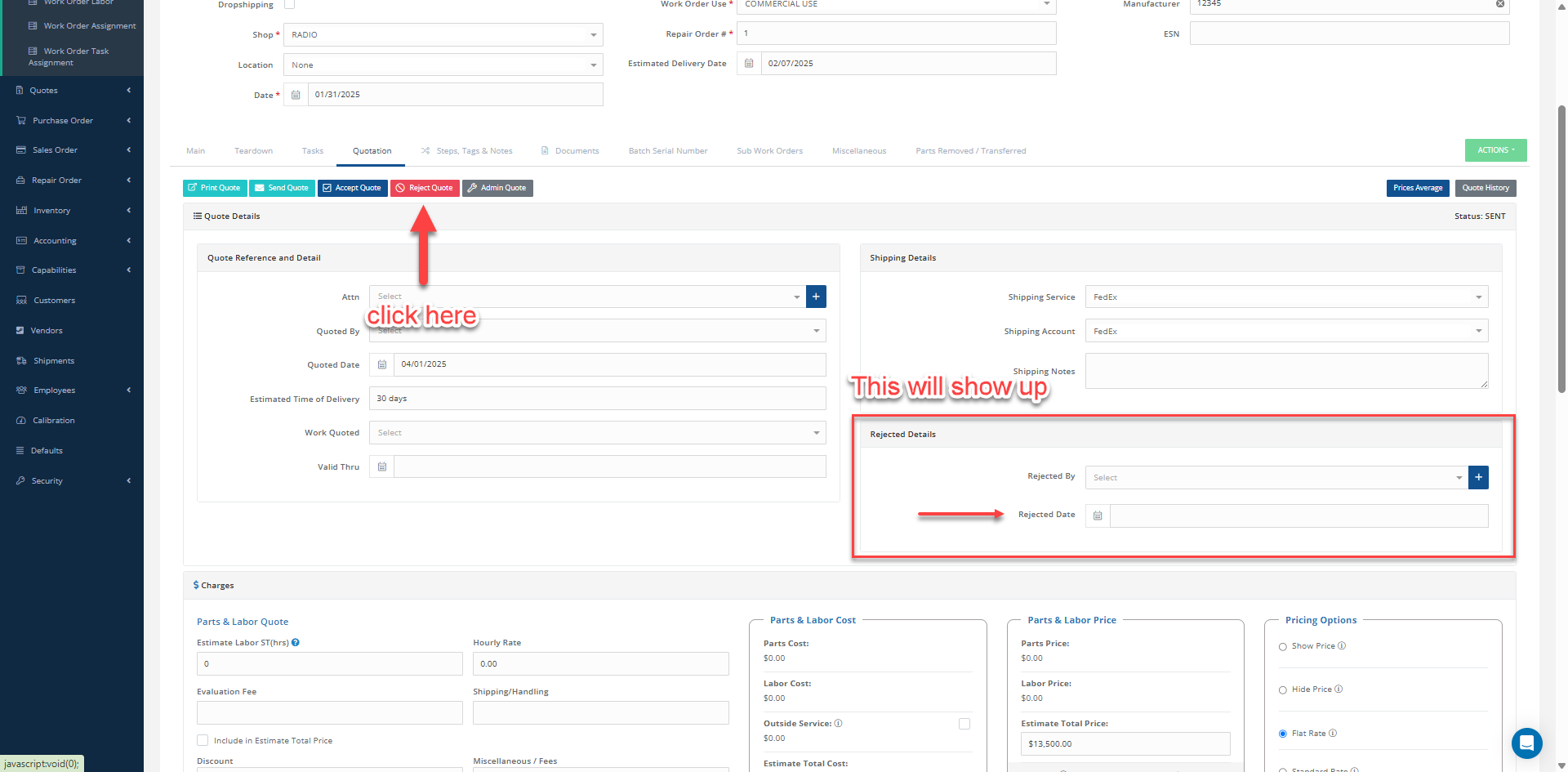 - If the work order is rejected, you can either send the client a revised quote and await approval , or close the order if no further action is needed.